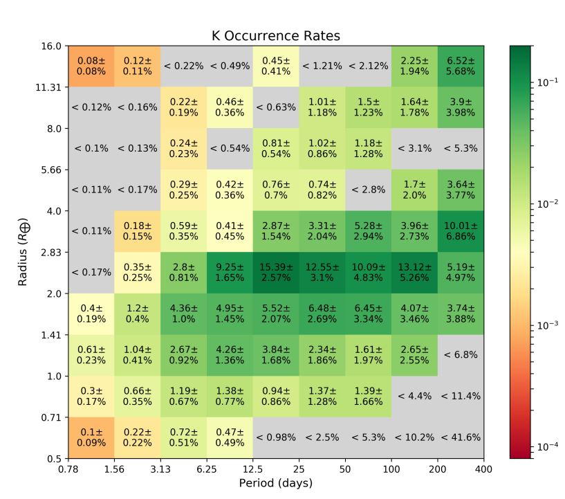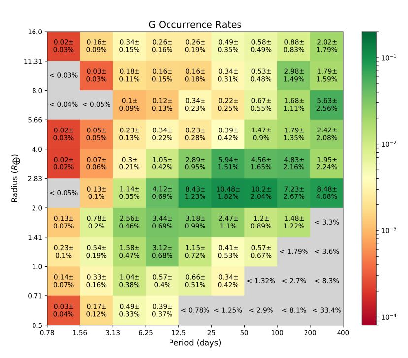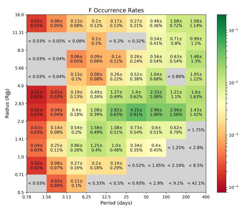 Výsledky vidíte níže. Na horním obrázku je celková míra výskytu pro všechny tři spektrální třídy. Na dolních pak pro jednotlivé spektrální třídy. Na vodorovné ose je oběžná doba (ve dnech), na svislé pak poloměr planet (v násobcích Země). Čísla v obdélníčcích udávají míru výskytu. Pokud je 0,27, pak to znamená, že daný typ planety se vyskytuje u přibližně 27 % hvězd atd.