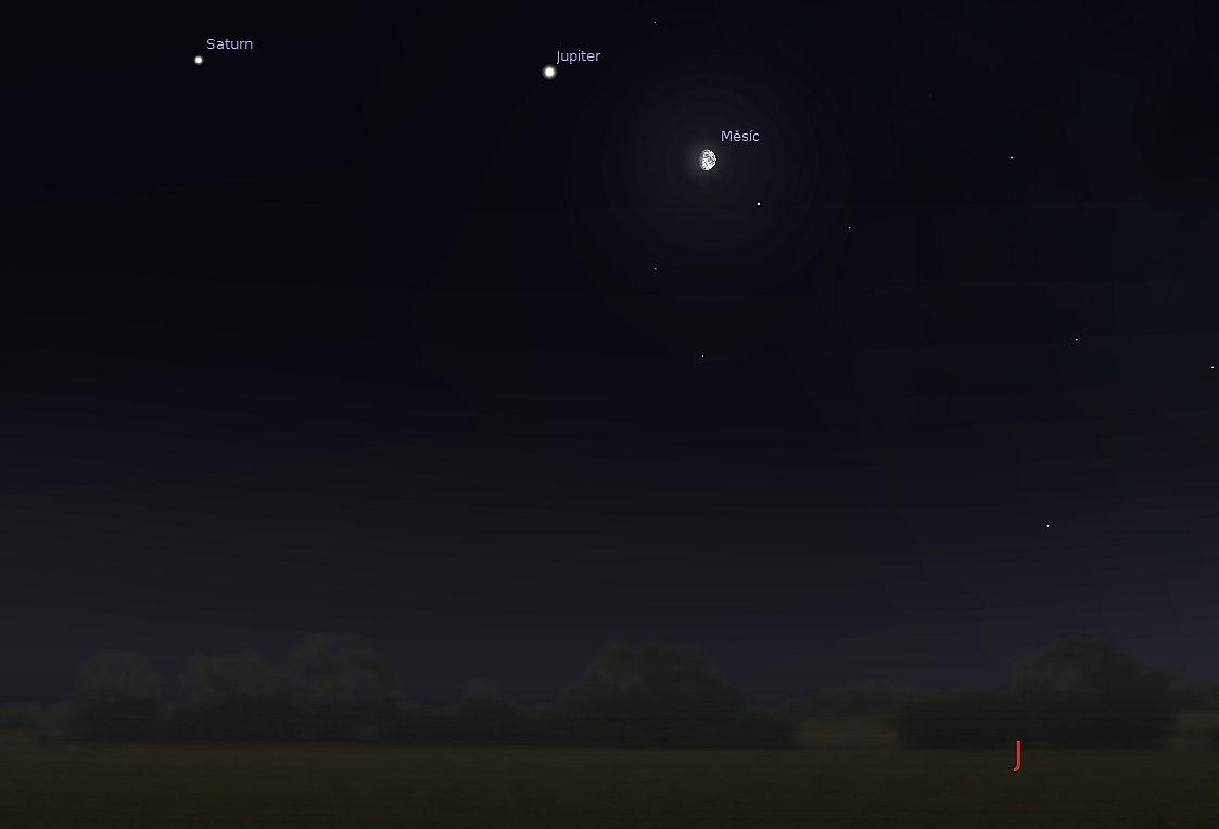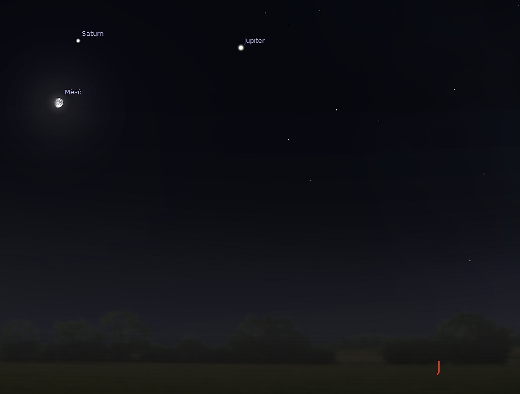 Pokud bude jasno, podívejte se večer směrem k jižnímu obzoru. Měsíc si tam dá rande s planetami Jupiter a Saturn.